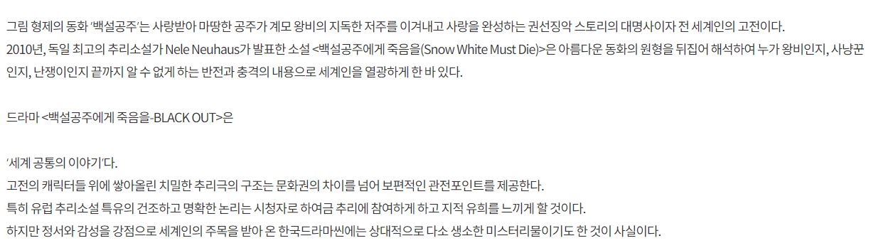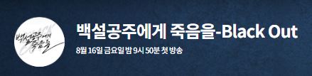 8월 16일 금요일 밤 9시 50분 첫방송을 시작한 '백설공주에게 죽음을 블랙아웃'. 주연, 조연 배우님들 얼굴, 그리고 드라마 제목만 보아도 정말 너무 관심을 가질 수 밖에 없어 이렇게 포스팅해보았어요. 추가적인 정보를 보고싶으신 분들이라면, 아래 드라마 공식 홈페이지 방문하실 수 있도록 작업을 해두었으니 참고해보시면 좋을 것 같아요.