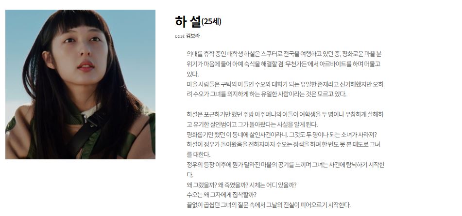 의대 휴학 중인 대학생 역할을 담당하는 배우 김보라님이에요. 어떤 연기를 보여주실 지 기대가 되네요