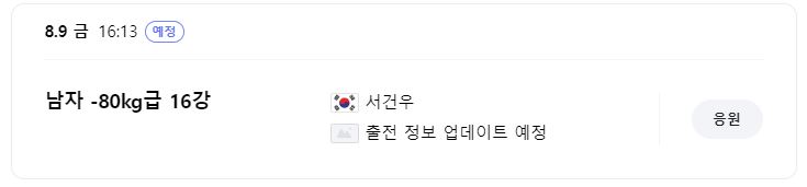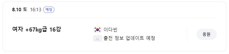 8월 8일 목요일 오후 4시 13분, 김유진 선수 출전해요. 상대가 누구인지는 아직 결정되지 않아 업데이트 되어 있지 않더라구요. 상대가 누구라도 잘 이겨낼 거라 믿어요! 화이팅!