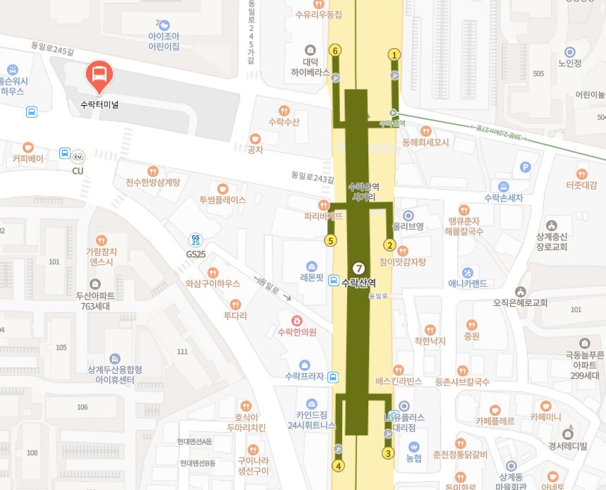 - 수락산역 6번 출구에서 도봉역 방면 도보 1분 한국 도심공항 수락터미널